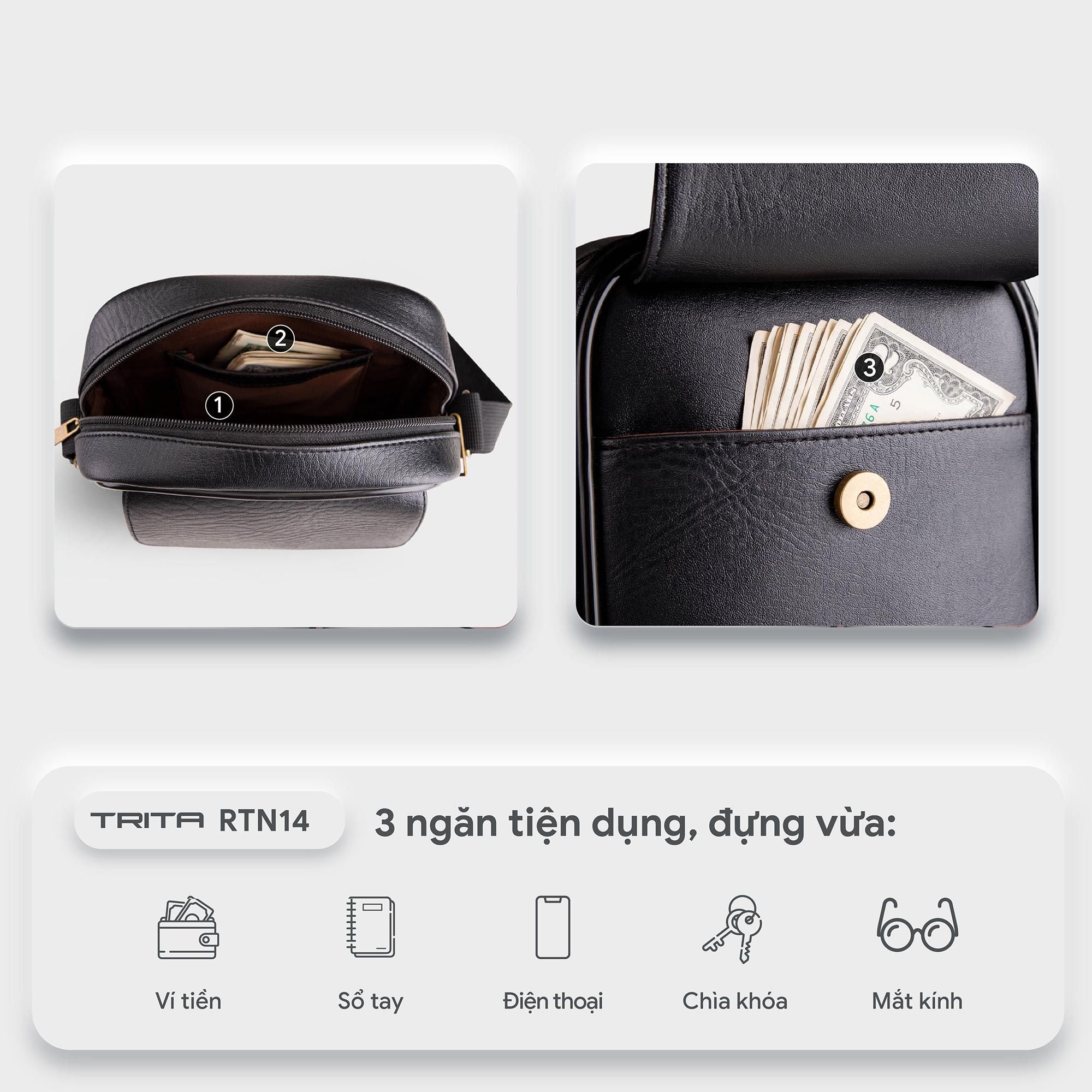 Túi đeo chéo da nam nắp gập Trita RTN14 mang hơi hướng cổ điển và lịch thiệp nhưng vẫn toát lên vẻ phóng khoáng. RTN14 được làm từ chất da tổng hợp cao cấp, bên trong lót vải mềm mại. Chiếc túi có thể đựng các vật dụng cá nhân như điện thoại, ví tiền, chìa khóa, mắt kính,... RTN14 sẽ giúp những bộ trang phục đi làm, dạo phố của bạn mới mẻ, phong cách hơn.