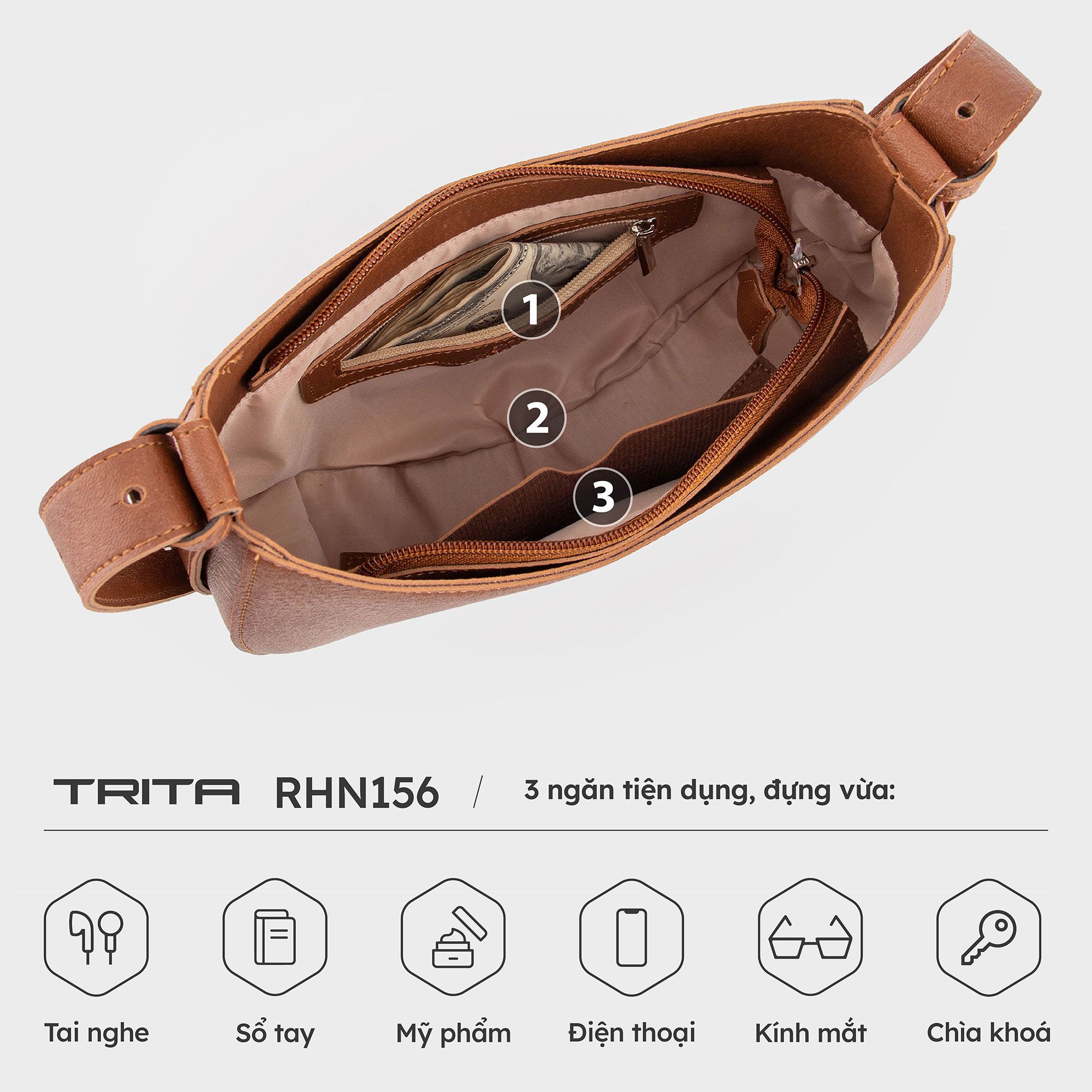 Túi đeo vai da nữ dáng bán nguyệt Trita RHN156 được thiết kế theo dáng trăng khuyết cách điệu kết hợp với dây đeo có thể tùy chỉnh chiều dài linh hoạt. Với chất liệu da tổng hợp cao cấp cùng màu sắc sang trọng giúp sản phẩm có độ đàn hồi tốt, chống thấm nước và độ bền cao, giảm hư hại và không bị lỗi thời theo năm tháng. Sản phẩm phù hợp sử dụng trong nhiều bối cảnh như đi chơi, du lịch, mua sắm và tiện lợi đựng vừa các vật dụng như bóp, ví, điện thoại, tai nghe, giấy tờ tùy thân...